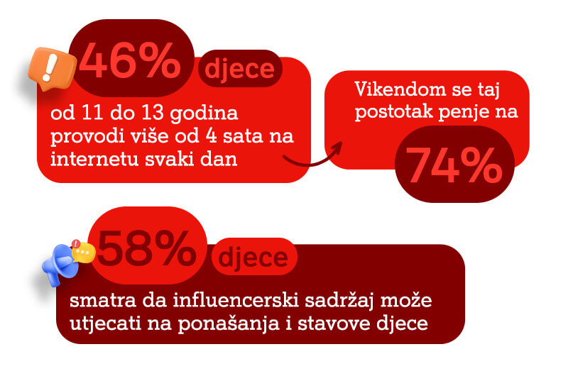 Prema Istraživanju o odgovornom korištenju tehnologije među djecom od 11 do 13 godina, koje je provela agencija Kvaka za A1 Hrvatska u studenom i prosincu prošle godine, 46% djece provodi više od četiri sata na internetu svaki dan, a vikendom se taj postotak penje na 74.